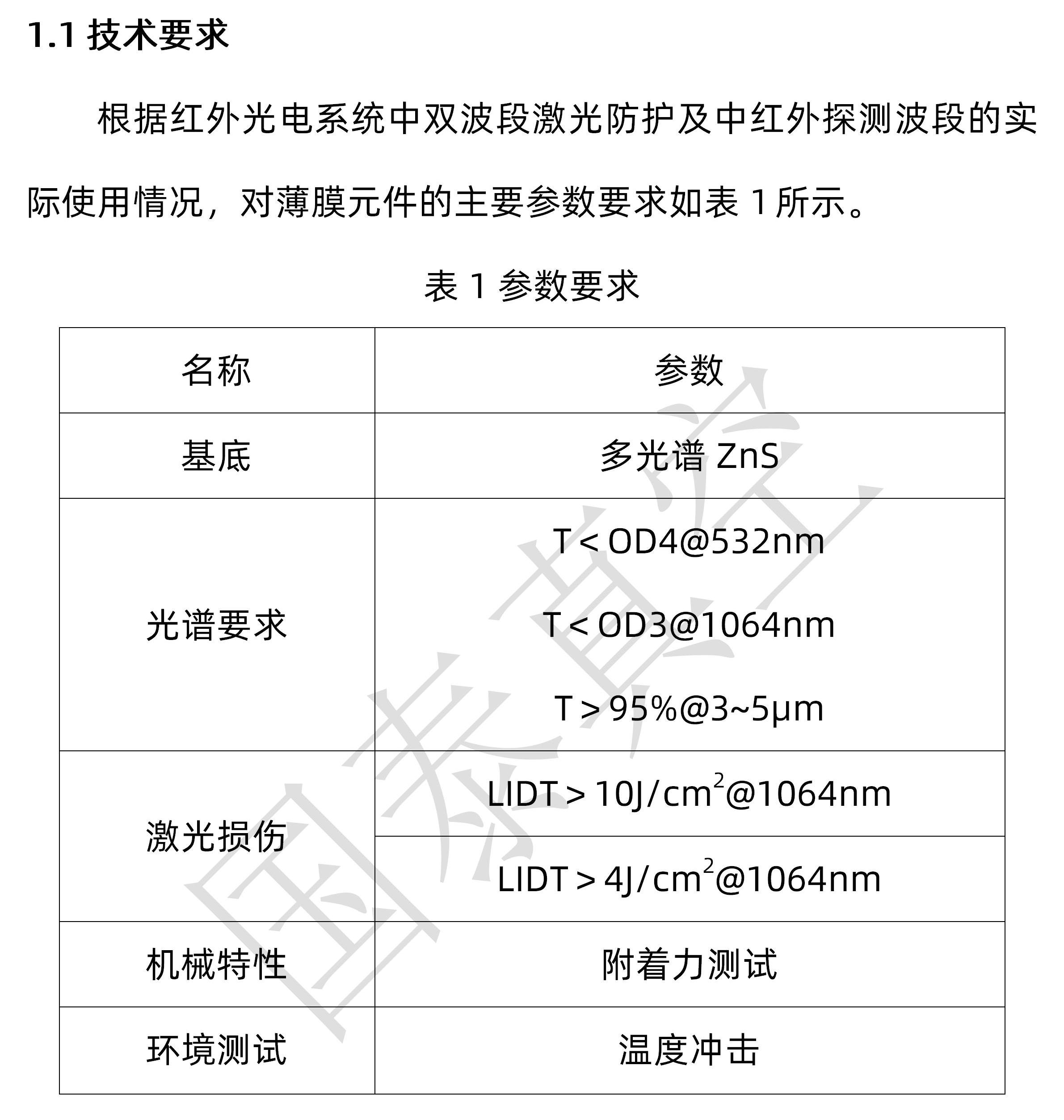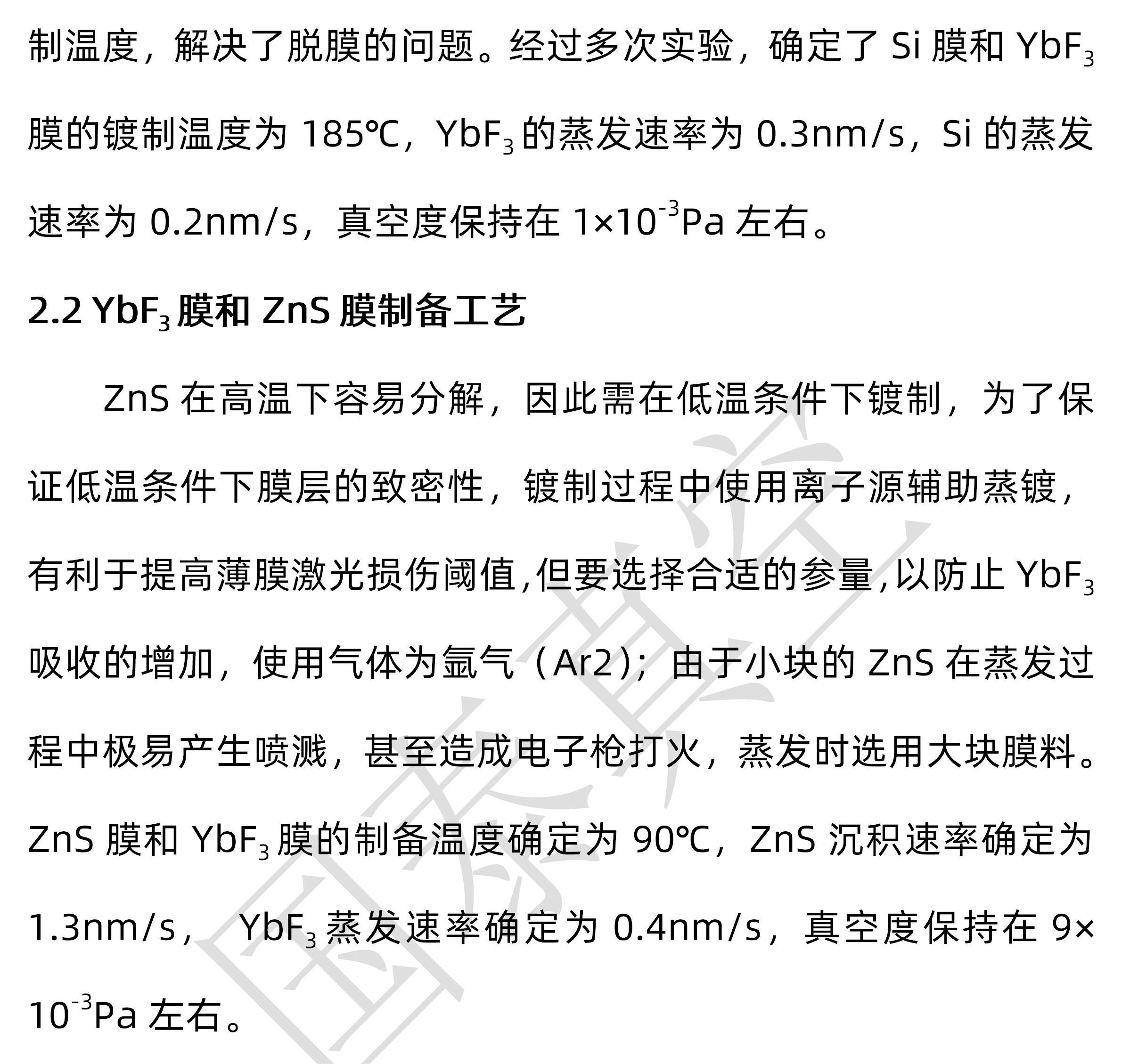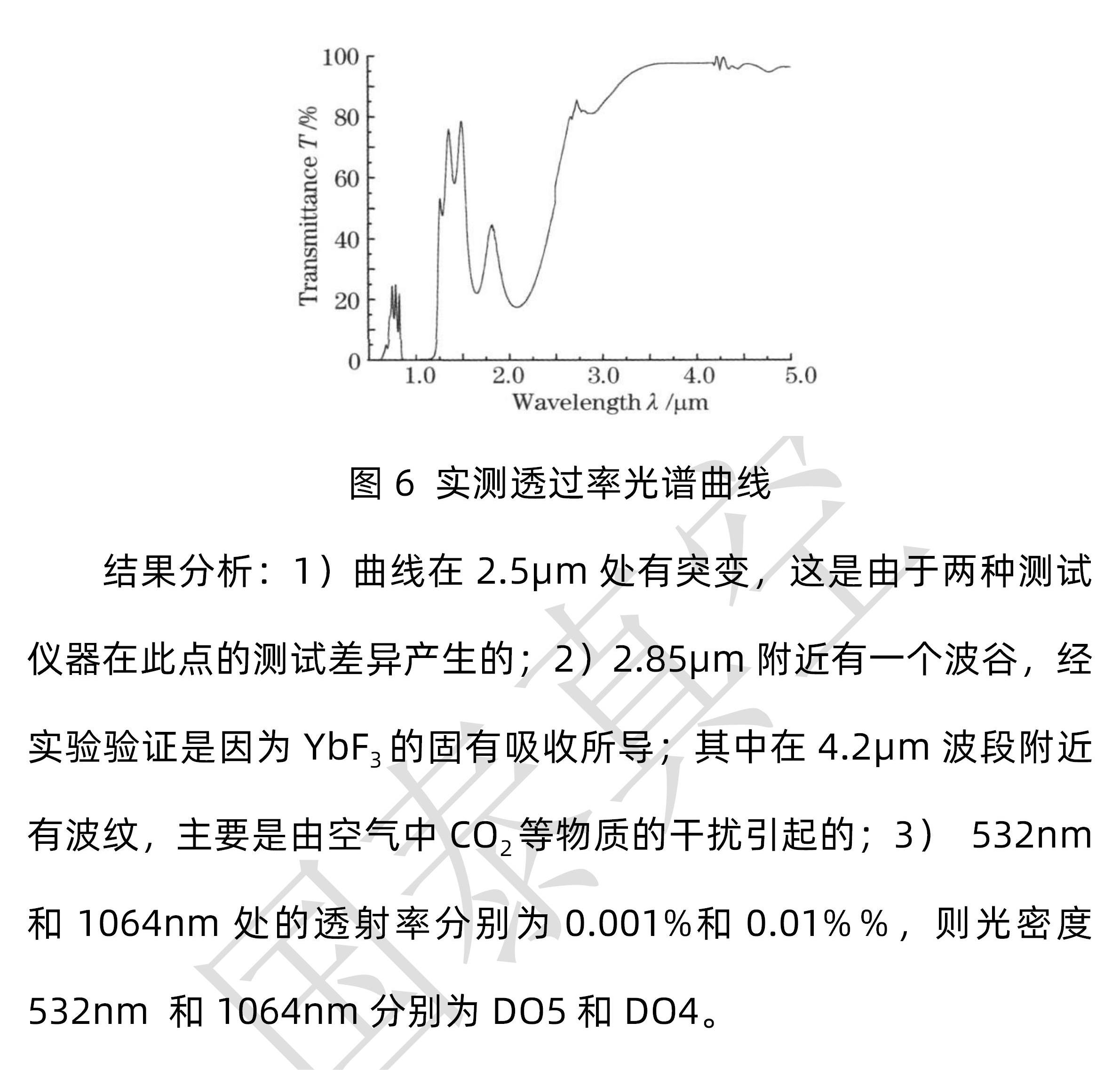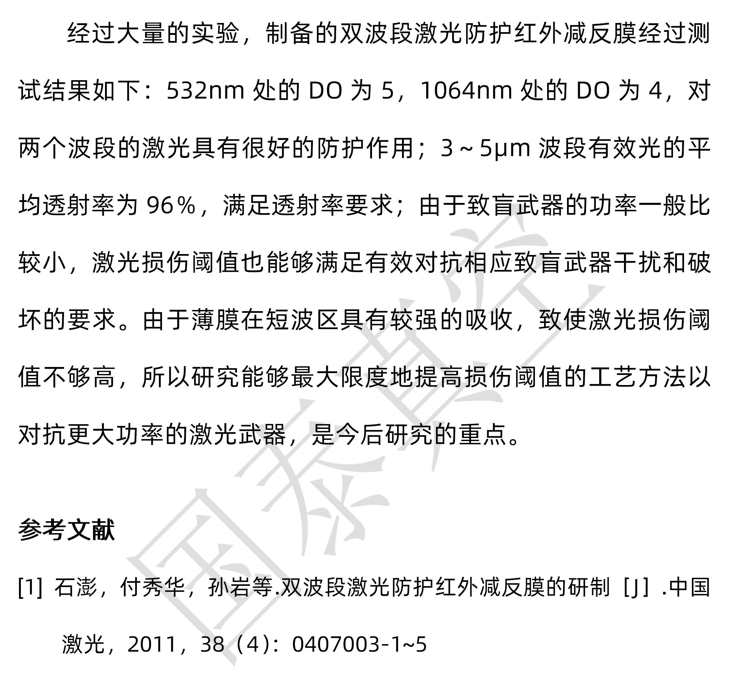 【提要描述】经过大宗的实验,制备的双波段激光防护红外减反膜经过测试结果如下:532nm处的DO为5,1064nm处的DO为4,对两个波段的激光具有很好的防护作用;3~5μm波段有效光的平均透射率为96%,满足透射率要求;由于致盲武器的功率一般比较小,激光损伤阈值也能够满足有效对抗相应致盲武器滋扰和破坏的要求。